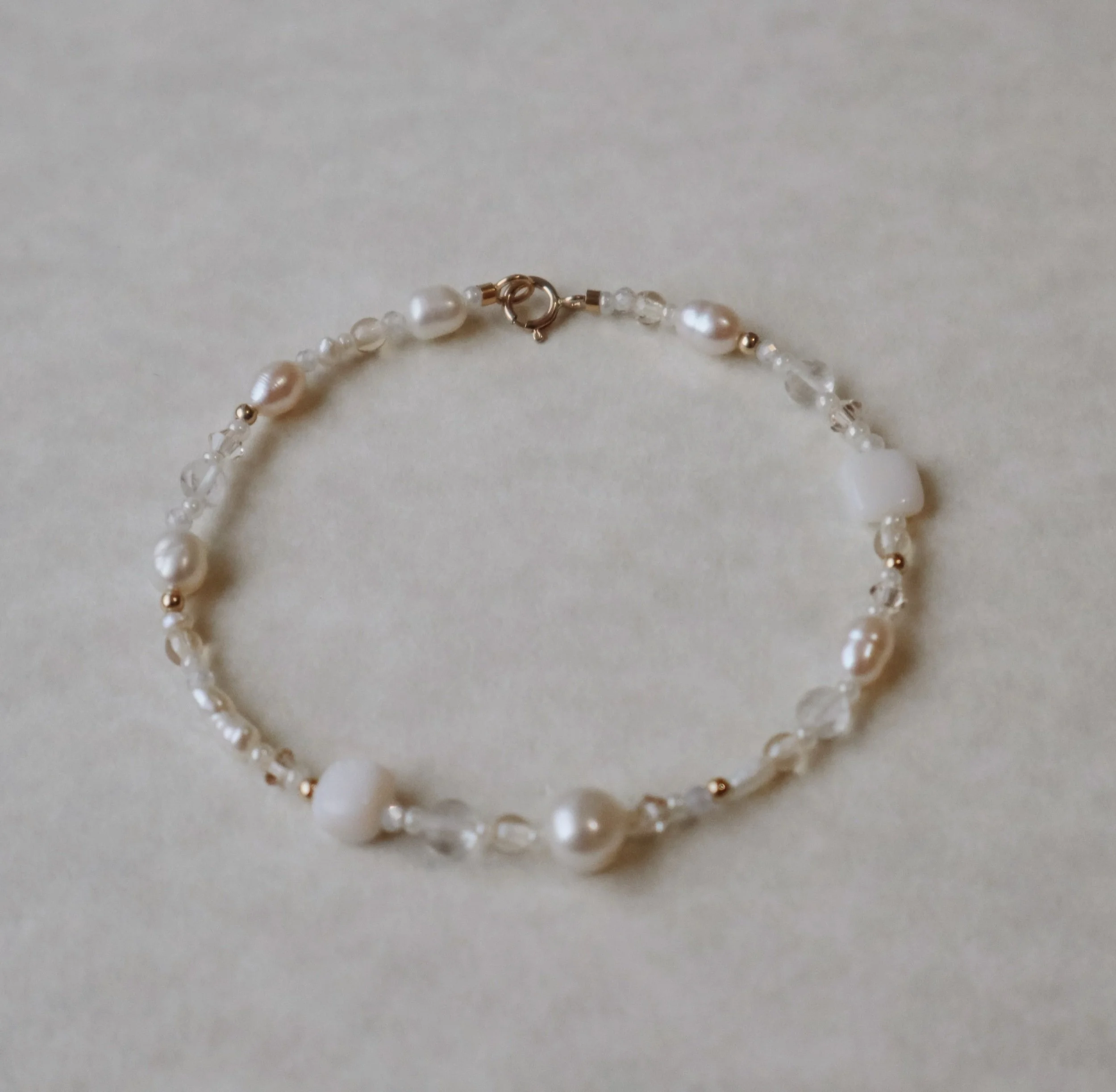 This bracelet features mother of pearl, clear quartz coin beads, fresh water pearls, tiny cubic zirconia & glass beads. Details are 14k gold filled for long lasting shine.