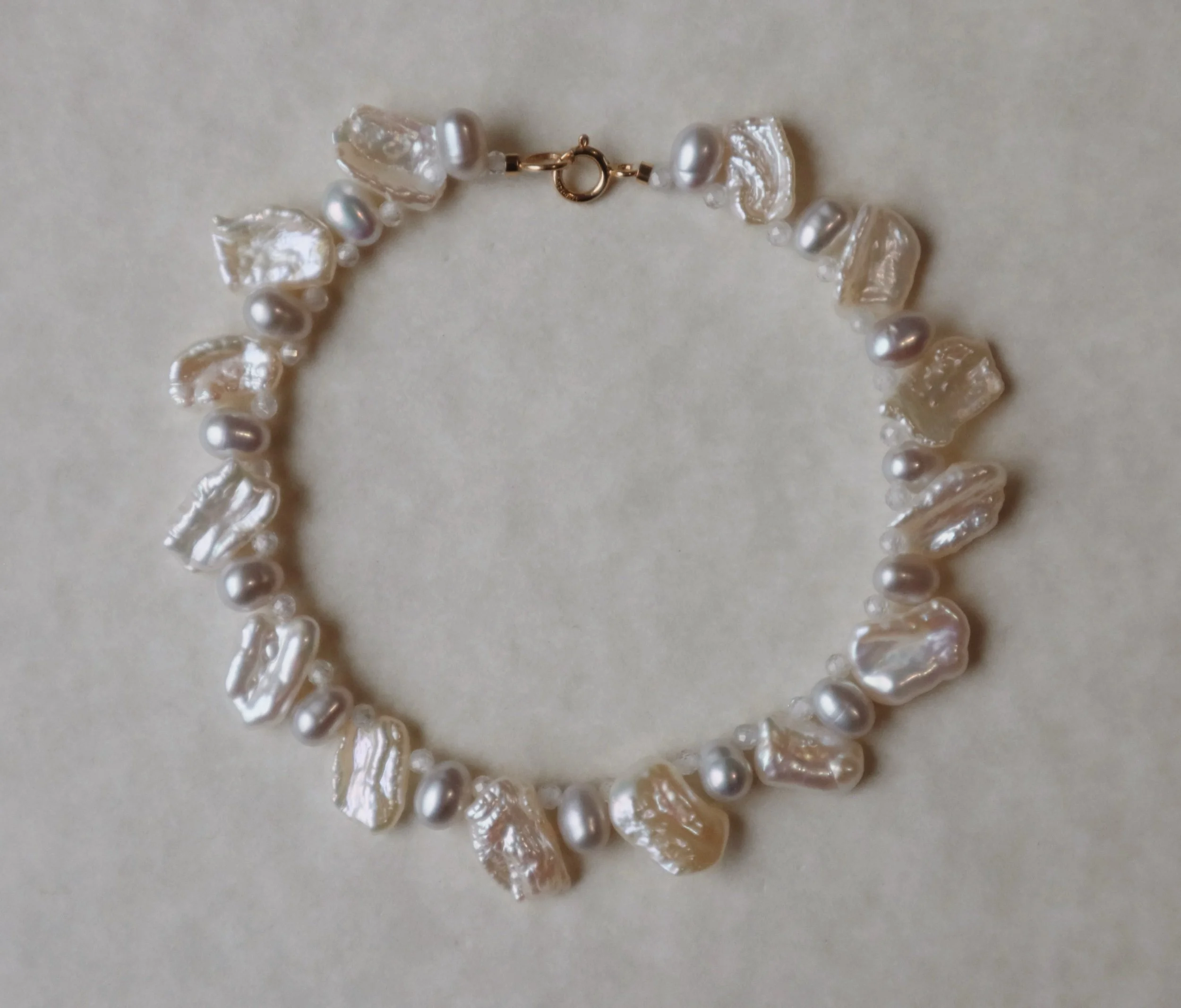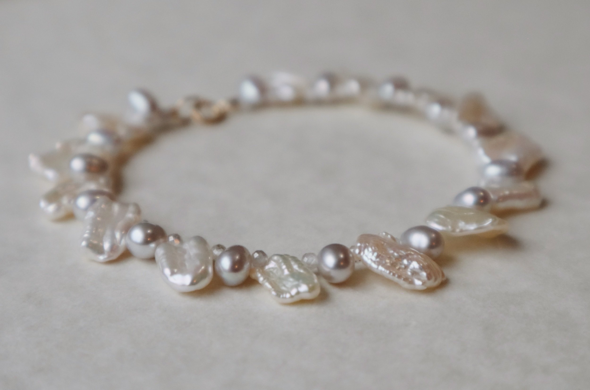 This bracelet features pale lilac pearls and keshi pearls with tiny cubic zirconia. Details are 14k gold filled for long lasting shine.